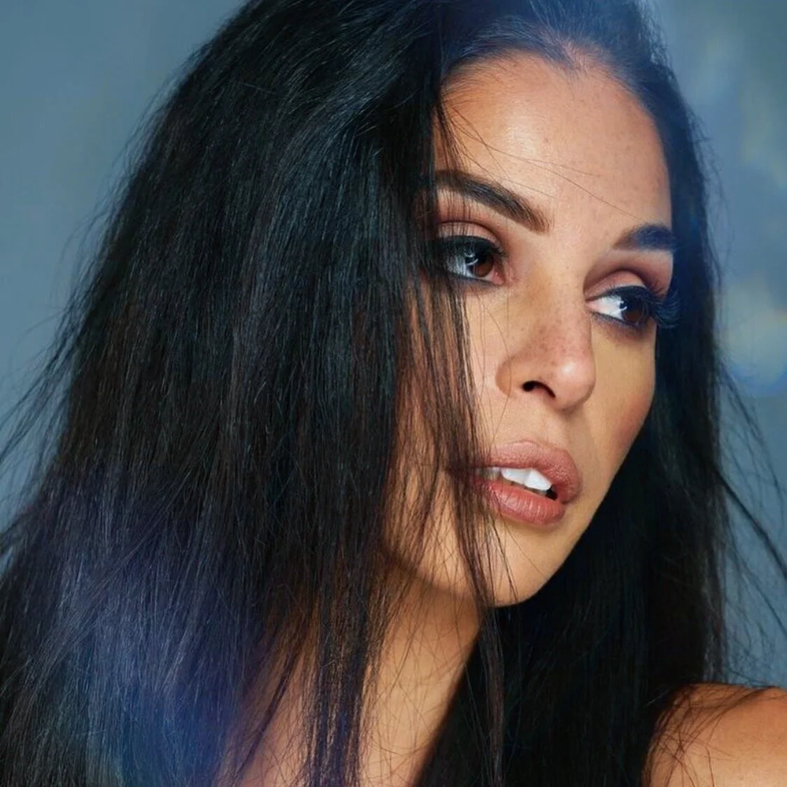 Close-up of a woman with long black hair, light brown skin, and makeup, looking to the side.