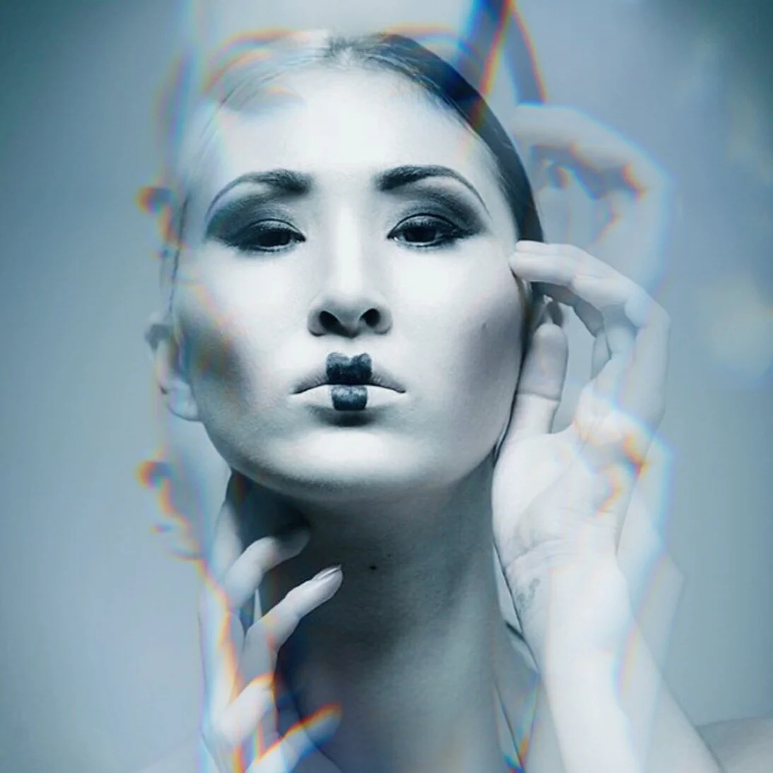 Black and white portrait of a woman with artistic makeup, her hands near her face, with digital glitches and rainbow interference.